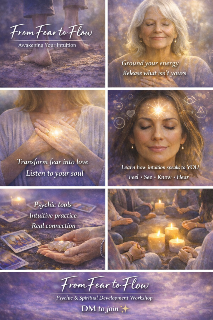 From Fear to Flow is an 8-week Psychic & Spiritual Development Workshop designed to gently guide you from grounding and self-awareness into the more expansive realms of intuitive practice.